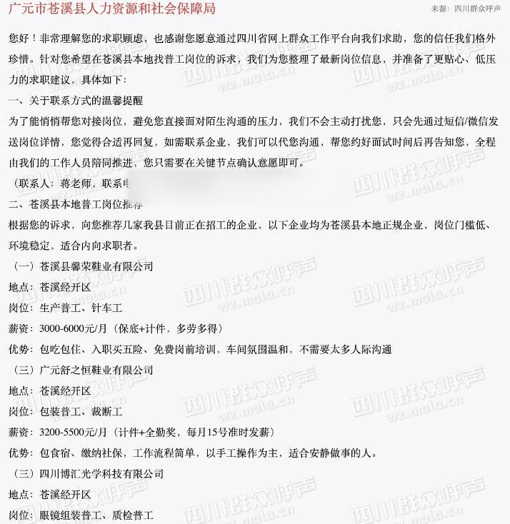 当日,广元市苍溪县人力资源与社会保障局(以下简称“苍溪县人社局”)作出回复,不仅推荐了苍溪县三家本地正规企业,岗位门槛低、环境稳定,适合内向求职”,还附上贴心提示,“车间氛围温和,不需要太多人际沟通”;“以手工操作为主,适合安静做事的人”。