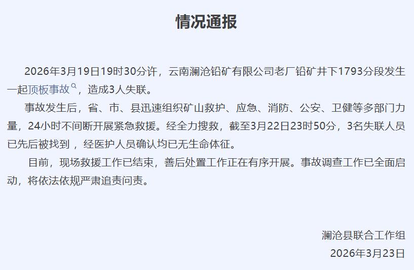 3月23日,南都N视频记者从云南省普洱市澜沧县获悉,云南澜沧铅矿有限公司老厂铅矿井下1793分段发生一起顶板事故致3死。南都记者查询获悉,就在3月上旬,该公司刚组织主要负责人参加云南省金属非金属地下矿山安全教育专题培训。
